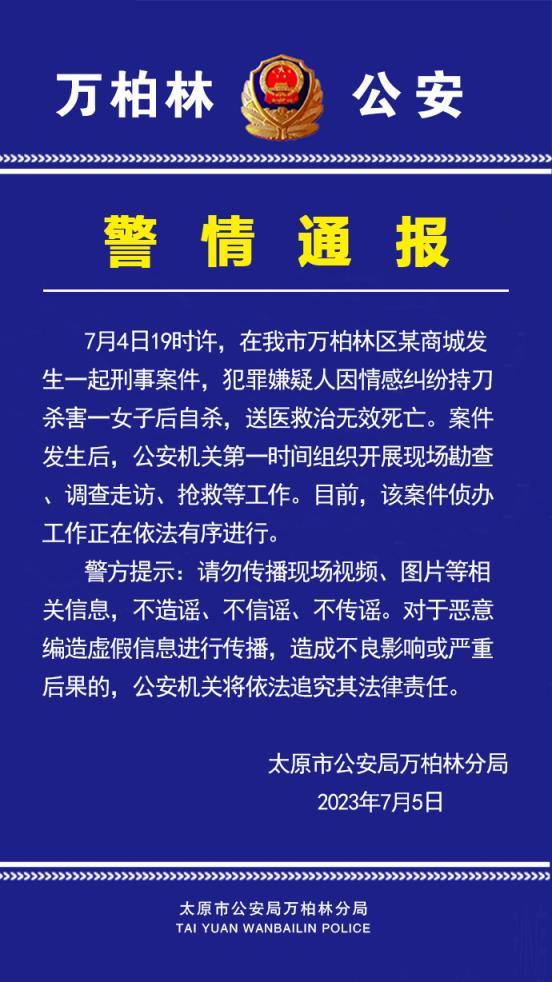 据太原市公安局万柏林区分局官方微博通报,该区某商城发生一起刑事案件,犯罪嫌疑人因情感纠纷持刀杀害一女子后自杀,送医救治无效死亡。