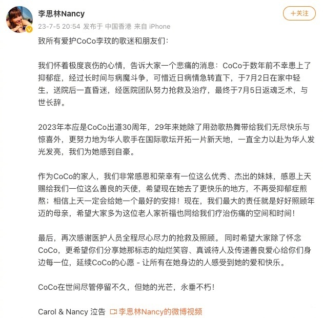 我们怀着极度哀伤的心情,告诉大家一个悲痛的消息:CoCo于数年前不幸患上了抑郁症,经过长时间与病魔斗争,可惜近日病情急转直下,于7月2日在家中轻生,送院后一直昏迷,经医院团队努力抢救及治疗,最终于7月5日返魂乏术,与世长辞。