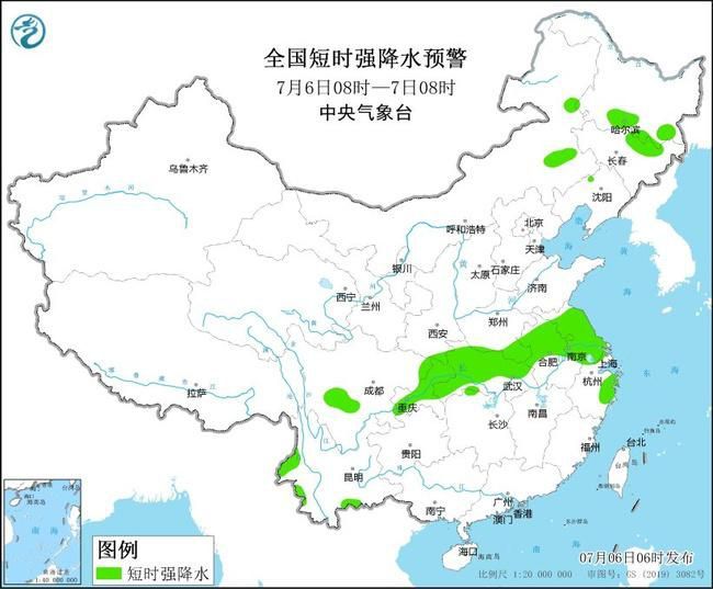 预计7月6日08时至7日08时,内蒙古东南部、黑龙江南部、吉林中东部、辽宁北部和西部、安徽中北部、江苏、上海、湖北东部、浙江东部等地的部分地区将有8-10级雷暴大风或冰雹天气;内蒙古东南部、黑龙江南部、吉林东部、河南南部、安徽中北部、江苏、上海、湖北、浙江北部和东部、四川东部和南部、重庆中西部和北部、云南西部和南部等地的部分地区将有短时强降水天气,小时雨量20-50毫米,局地可达60毫米以上。