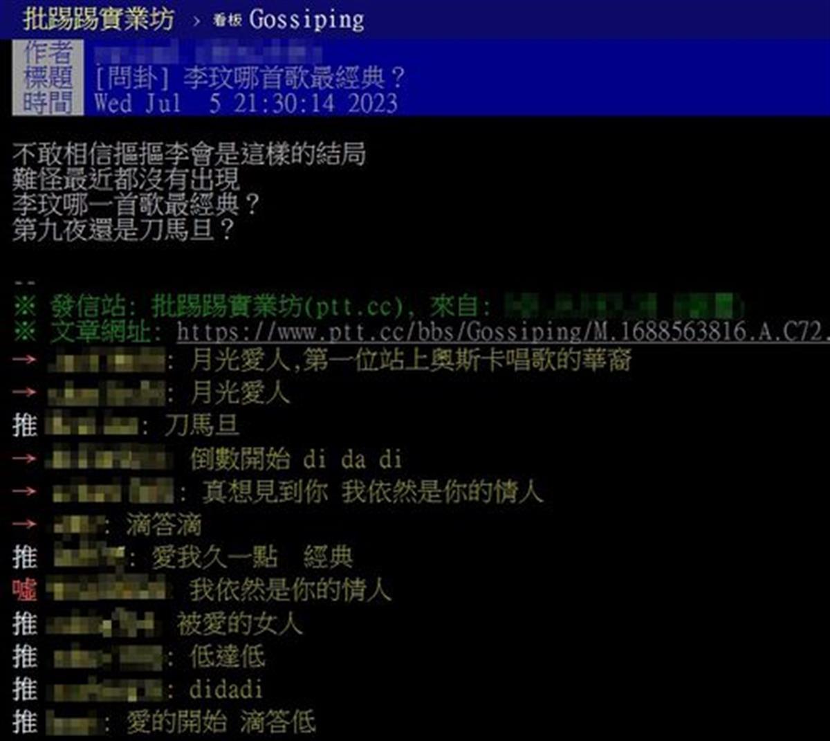 一名网友昨晚在批踢踢发文表示,不敢相信李玟最后会是这样的结局,并发起讨论:李玟的哪一首歌最经典?这位网友认为应该是《刀马旦》或者《第九夜》。