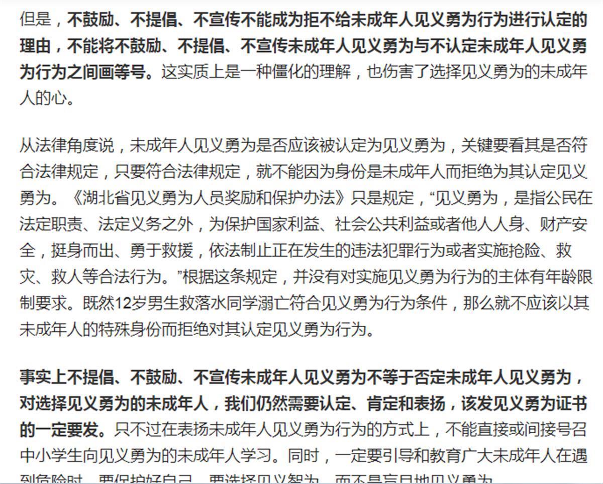 于是,一些地方拒绝给未成年人见义勇为相关荣誉,怕被认为是提倡、鼓励、宣传未成年人见义勇为。不得不说,这里面存在误区。