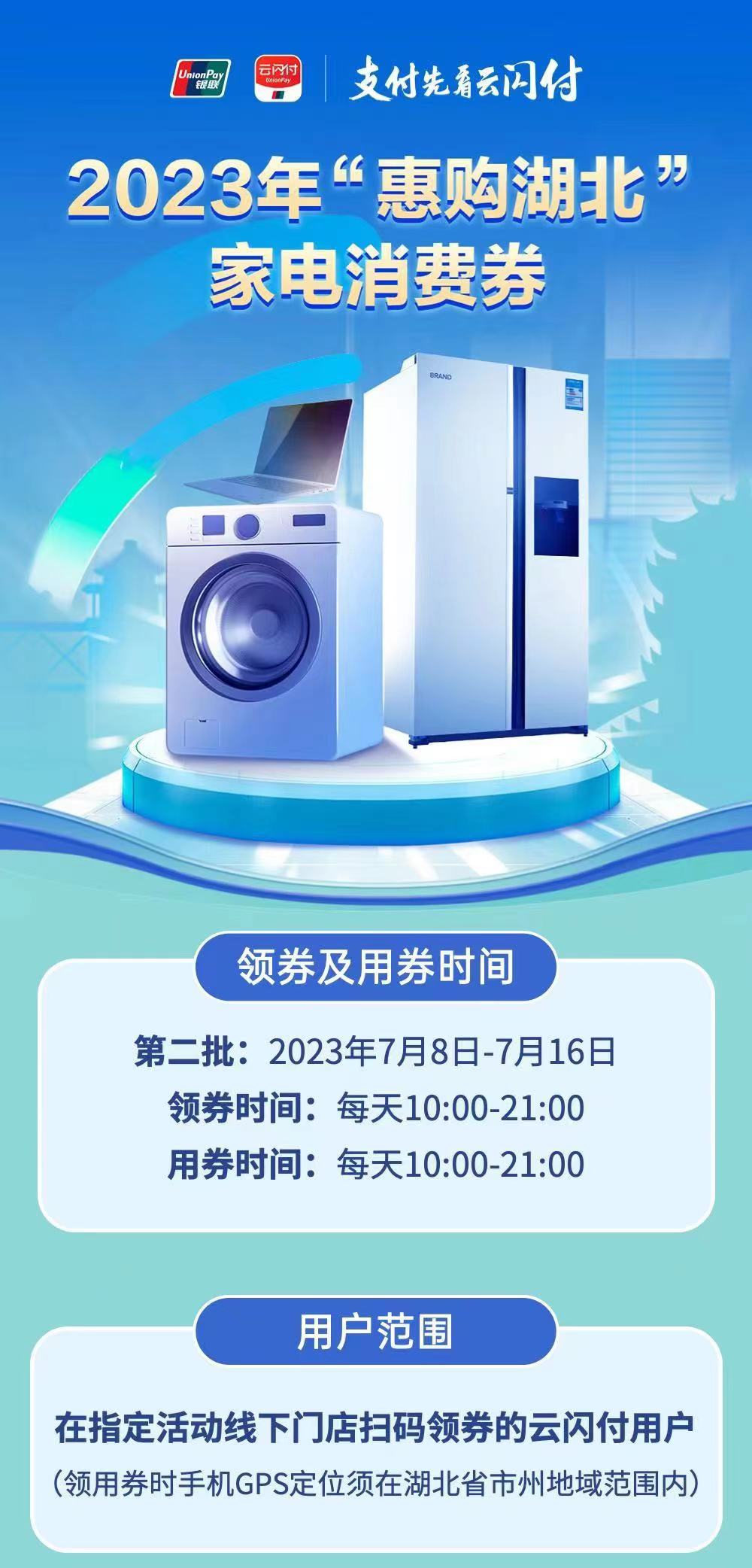随着三伏天的到来,“烧烤模式”即将开启,7月8日起,第二批“惠购湖北”家电消费券又将发放,活动时间为7月8日-7月 16日每天10:00-21:00。与以往消费券在APP上领券不同,此次消费券需消费者到活动商家门店现场扫码领取,湖北辖区内的市民可到指定参与活动的家电商户现场,使用云闪付APP扫码领券,领券用券时需打开云闪付GPS定位权限。本次家电消费券设100元、300元、500元三种面额,10倍核销门槛,即在扣除平台及商户的各类优惠后,消费者购买的家电待付金额分别达到1000元、3000元、5000元,即可对应核销使用1张家电消费券。一笔交易只能核销1张家电消费券,领取的消费券需在当天21:00前核销使用,单批次活动期间最多可核销2张家电消费券。