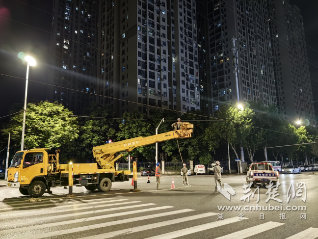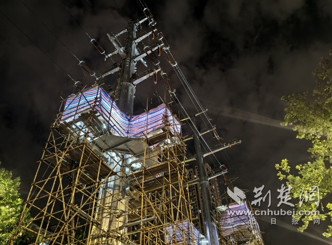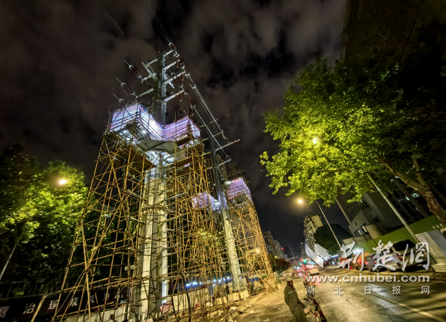 当晚10时许,在到位于汉口兴业路与后湖四路交汇处的施工现场,高压电塔上的“线缆接头”已经安装完成,即将进行线路迁改完工后的送电。