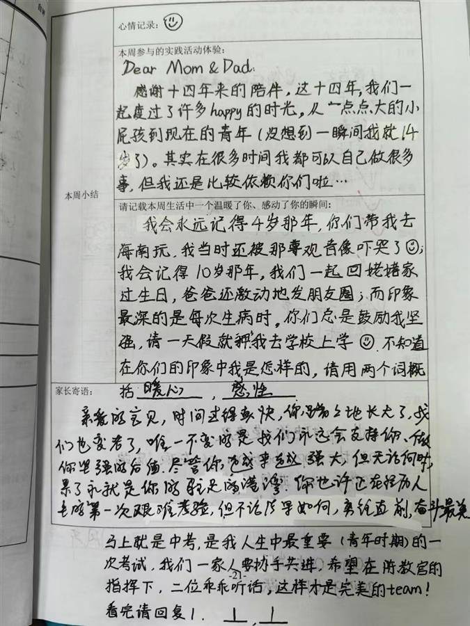 为了帮学生们调整好临考状态,丁园圆为班上的学生还安排了“心情日记”,鼓励学生们每天记录自己想要向老师、家长以及自己表达的感受,同作业一起上交,与老师展开一对一“对话”。