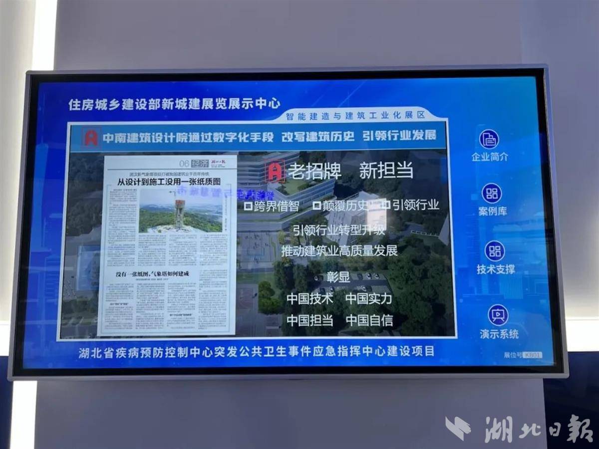 中南建筑设计院参与展示的是湖北省疾病预防控制中心、武汉市新一代天气雷达、全球首个建筑全生命周期管理PLM平台、大A工程网等实践成果,打破建筑业千百年传统,在设计、施工过程中,不依赖任何二维图纸、完全依靠三维数字模型,让建筑业像航天、汽车、船舶等先进制造业一样实现全流程数字化转型。