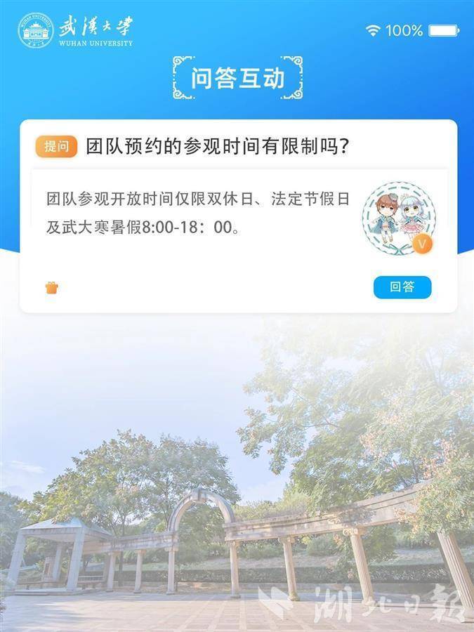 参观开放时间为双休日、法定节假日,及武大寒暑假的8:00-18:00,遇重要活动或极端天气等不宜开放的情况,暂停预约功能,暑期预约咨询及回复均通过邮箱(635928493@qq.com)进行处理。