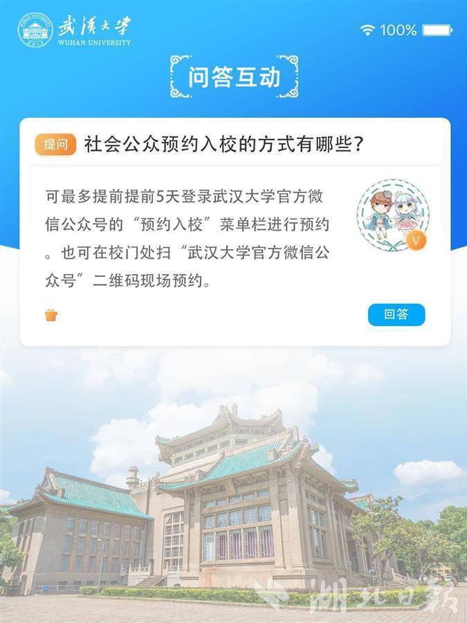 7月8日起,社会公众可通过预约方式进入武汉大学参观。武汉大学发布入校提示:社会公众可通过线上线下方式预约进校参访,学校办公楼、教学楼等场所不对外开放,请参访人员爱护校内设施和校园环境,行止有序、谦让有礼、文明参观。详情如下: