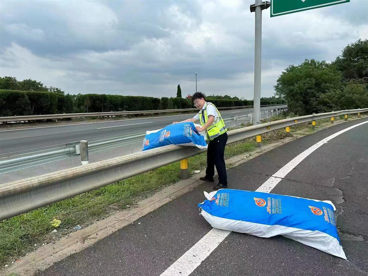 为防止货车沿路抛散,及时消除安全隐患,在将此处的袋子搬离路面后,两人又沿着匝道一路巡查至主路,未发现路面还有抛散物。30分钟后,道路恢复正常通行。