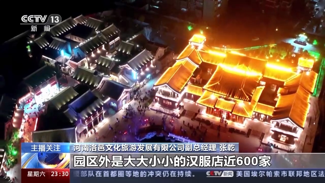 河南洛邑文化旅游发展有限公司 副总经理 张乾:其实,有很多摄影师也是来自全国各地,给这些汉服爱好者进行拍照,它其实也是一种新兴的业态。因为洛邑古城内是一步一景,我们打造了近百处网红打卡点,园区外是大大小小的汉服店近600家。