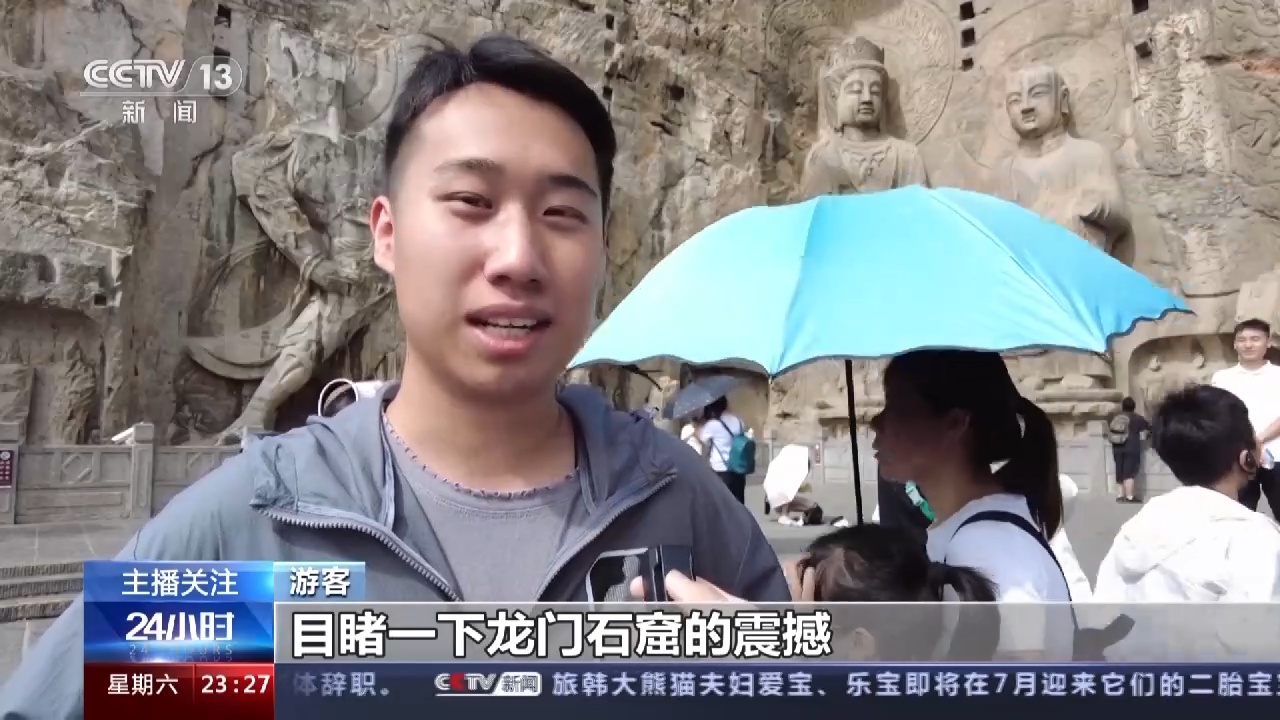河南台记者:洛都四郊,山水之胜,龙门首焉。这是白居易来到龙门石窟的时候发出的感慨。在龙门石窟,有大大小小的石刻造像十多万尊,每一尊可以说都是栩栩如生。今天的室外温度已经高达40℃。但是依然阻挡不了大家来这里游玩的热情。
