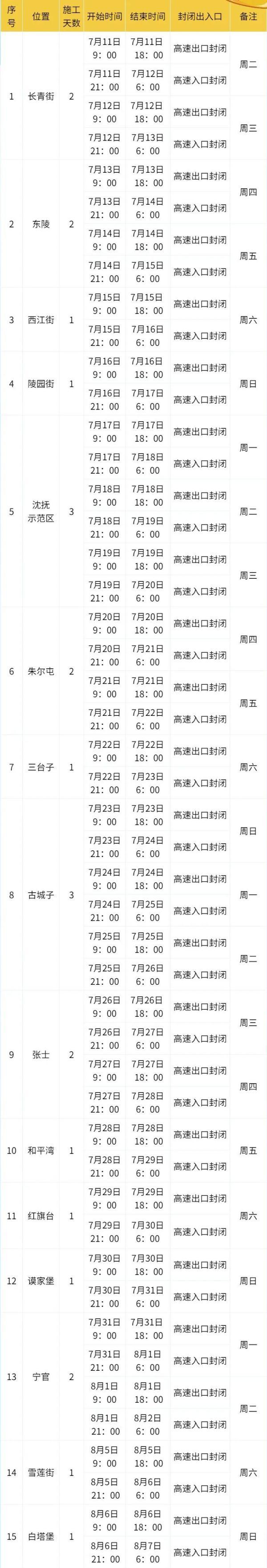 沈阳绕城高速公路因道路养护施工需要,2023年7月11日起至2023年8月6日(遇特殊天气或政策性停工,工期顺延),将依次对沈阳绕城高速公路长青街、东陵、西江街、陵园街、沈抚示范区、朱尔屯、三台子、古城子、张士、和平湾、红旗台、谟家堡、宁官、雪莲街、白塔堡共15座收费站出入口进行临时封闭施工,每日只封闭单个收费站。