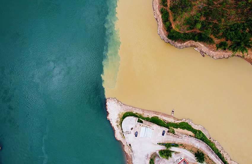 随着雨季来临,云南省临沧市云县忙怀乡境内的澜沧江流域出现“泾渭分明”奇观:在澜沧江支流罗扎河与澜沧江干流交汇处,一边是澄碧的澜沧江江水,一边是浑浊的罗扎河,一清一浊,界限分明,两水交汇后流出很远才逐渐融合。