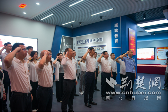 在京山公安警史馆的党建厅,京山公安党员民警与武珞律师事务所党支部党员代表共同开展重温入党誓词活动。
