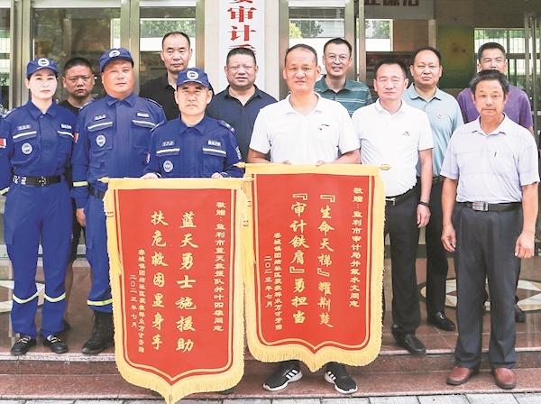 7月10日,叶四雄、戴水文(前排左一、左二)收到获救者送来的锦旗。通讯员潘波摄