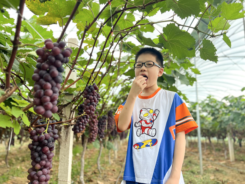 “哇,这里有好多葡萄呀!”小游客陈锦艺说,“这次能和妈妈一起采葡萄太开心了!这里的葡萄又大又甜,好好吃!”