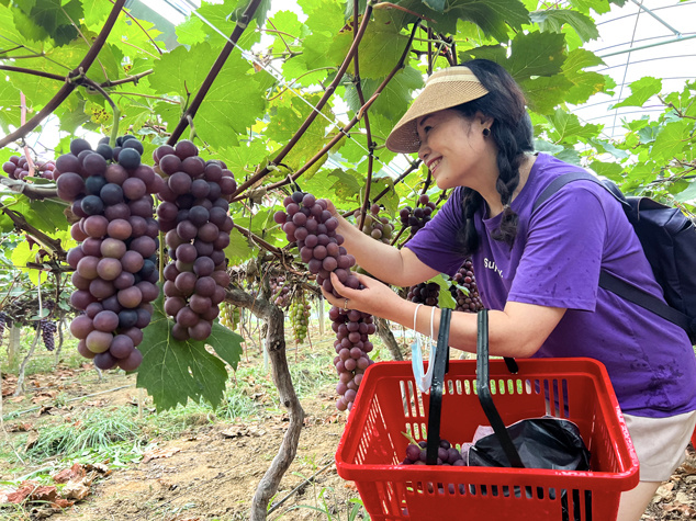 果为媒,引八方来客。园中前来采摘的游客络绎不绝,他们亲手摘下新鲜的葡萄,体验田园采摘果实的乐趣。“这里种植的葡萄口感非常好,非常甜,满口留香,我们家老人小孩都爱吃。“游客朱朱说。