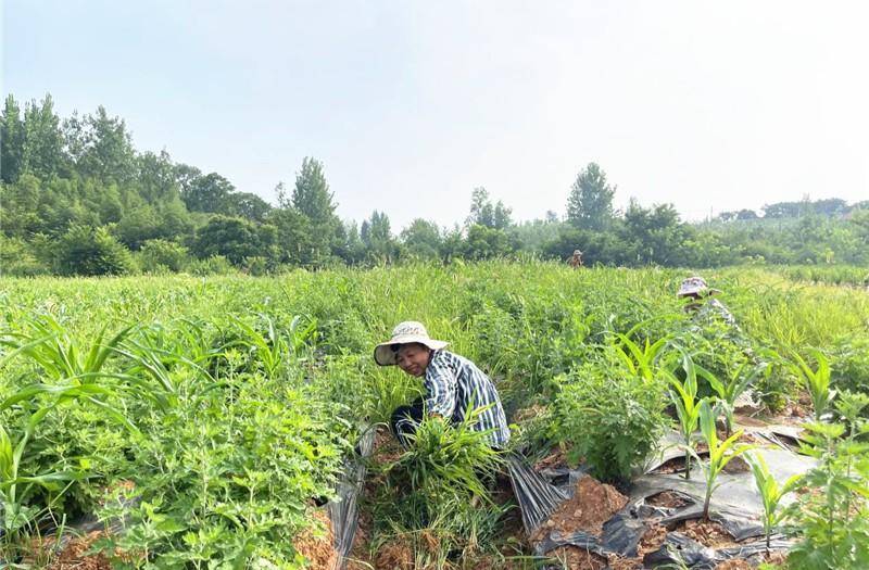 湖北日报客户端讯(通讯员 冷晶晶 邹澄圣 陈颖灿 许渴锞)7月11日,在谷城县茨河镇陶湾村菊花种植基地里,10余名村民正在菊花套种玉米地里除草、给玉米施肥、给菊花修剪打顶。