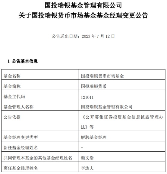 中国经济网北京7月12日讯 今日,国投瑞银基金管理有限公司发布基金经理变更公告,李达夫离任国投瑞银货币(A类121011;B类128011;D类018486)。