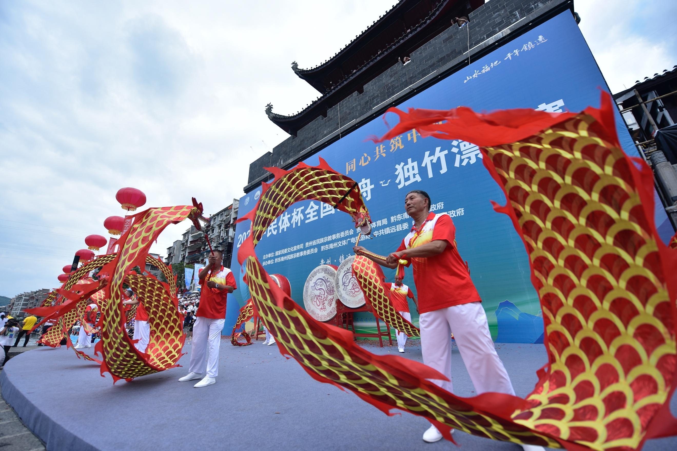 7月12日上午,2023年民体杯全国龙舟、独竹漂比赛举行开幕式。镇远县融媒体中心供图