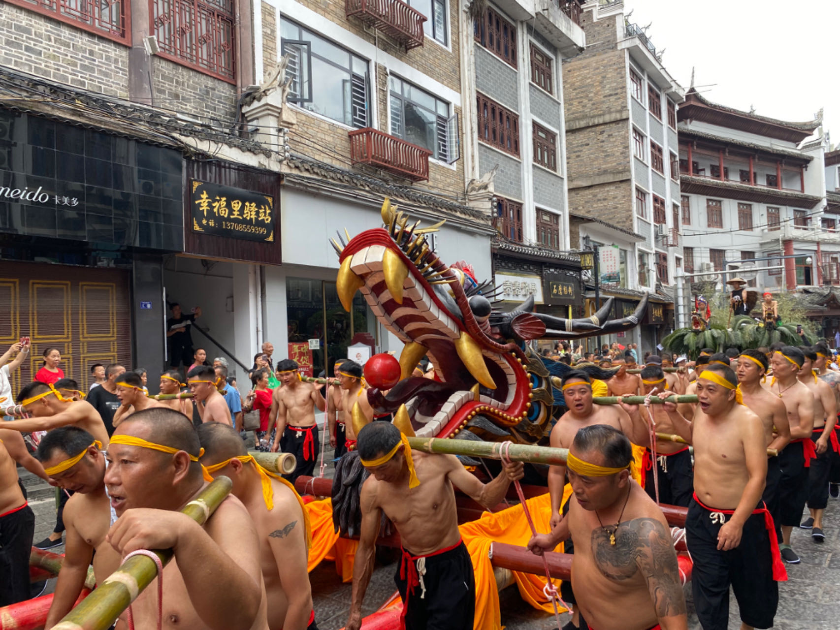 7月12日上午,2023年民体杯全国龙舟、独竹漂比赛开幕式前,镇远古城内举行展现镇远历史文化、古商文化、民族民间文化的陆上游行活动。镇远县融媒体中心供图