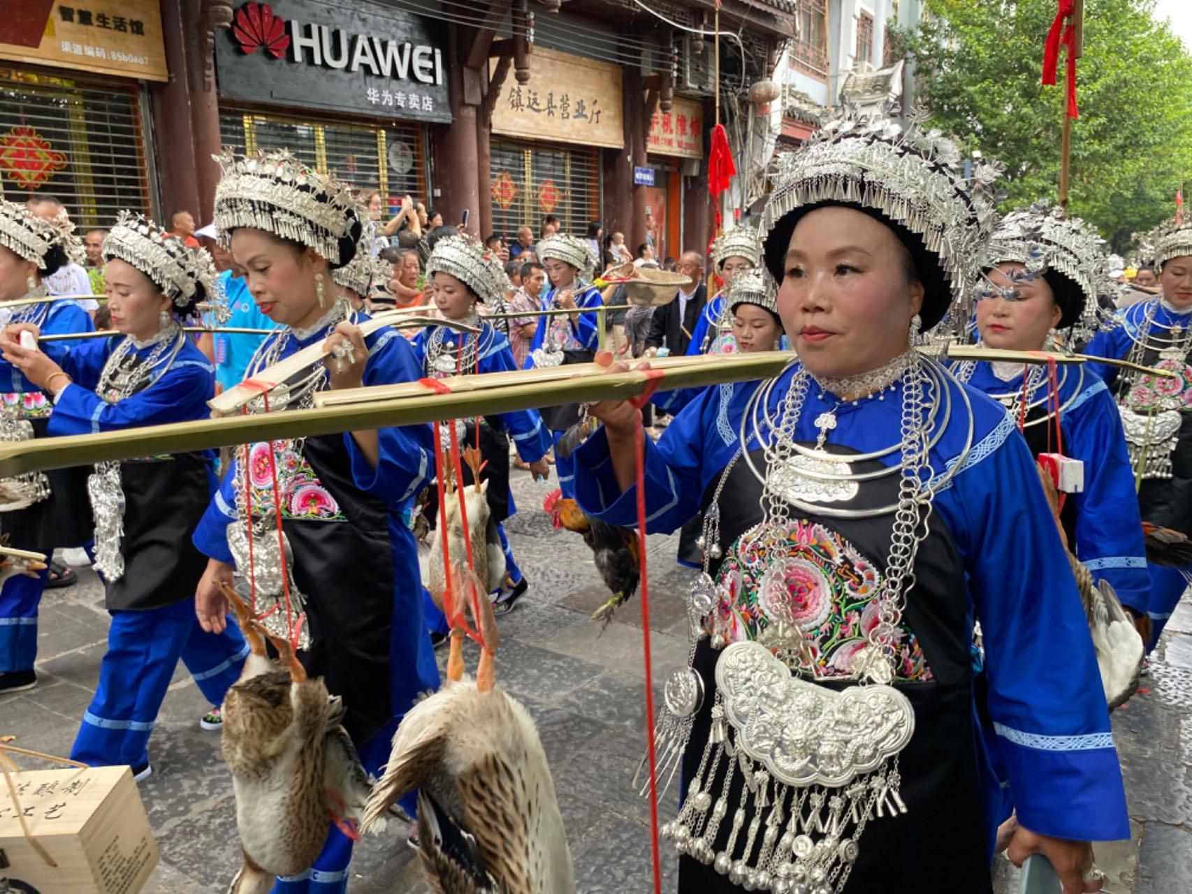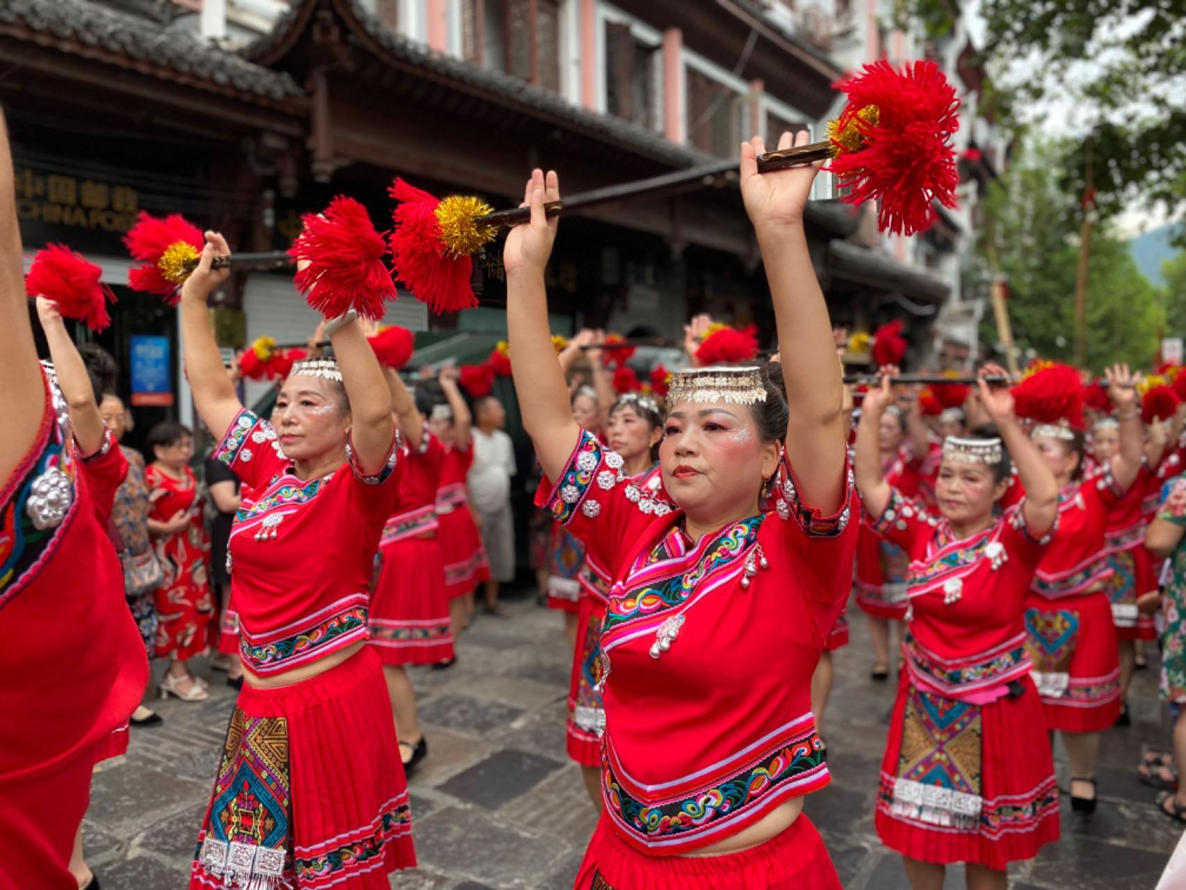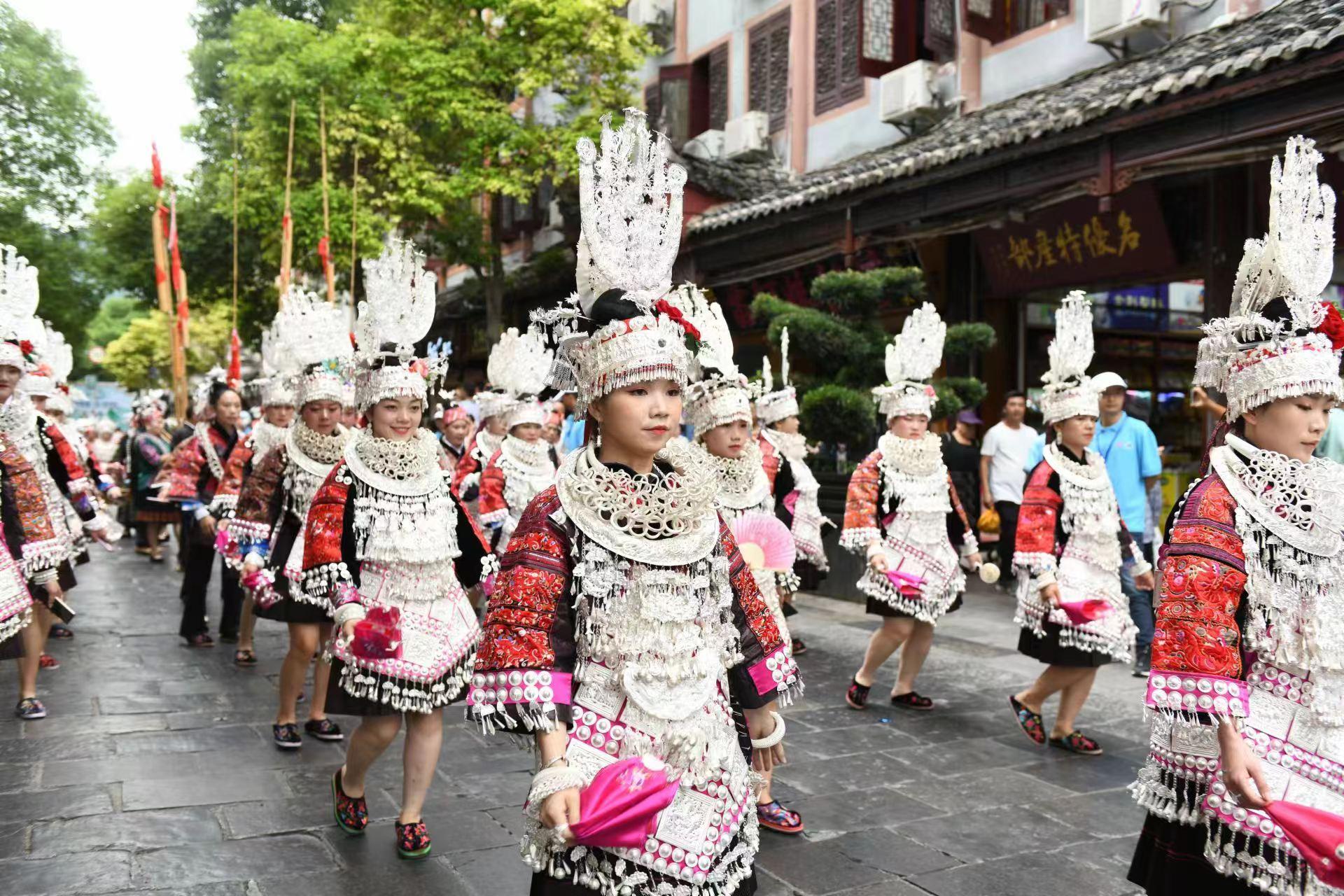 7月12日上午,2023年民体杯全国龙舟、独竹漂比赛开幕式前,镇远古城内举行展现镇远历史文化、古商文化、民族民间文化的陆上游行活动。人民网彭静 摄