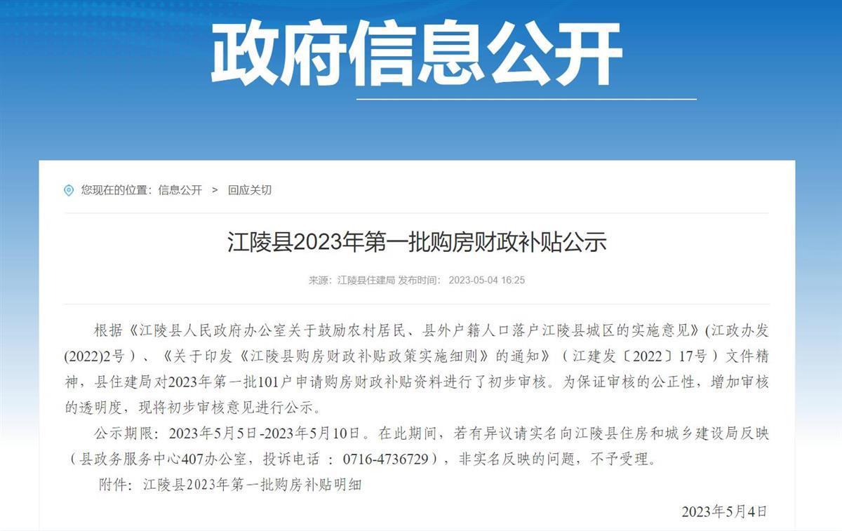 5月4日,江陵县对2023年第一批购房财政补贴进行公示(网站截图)