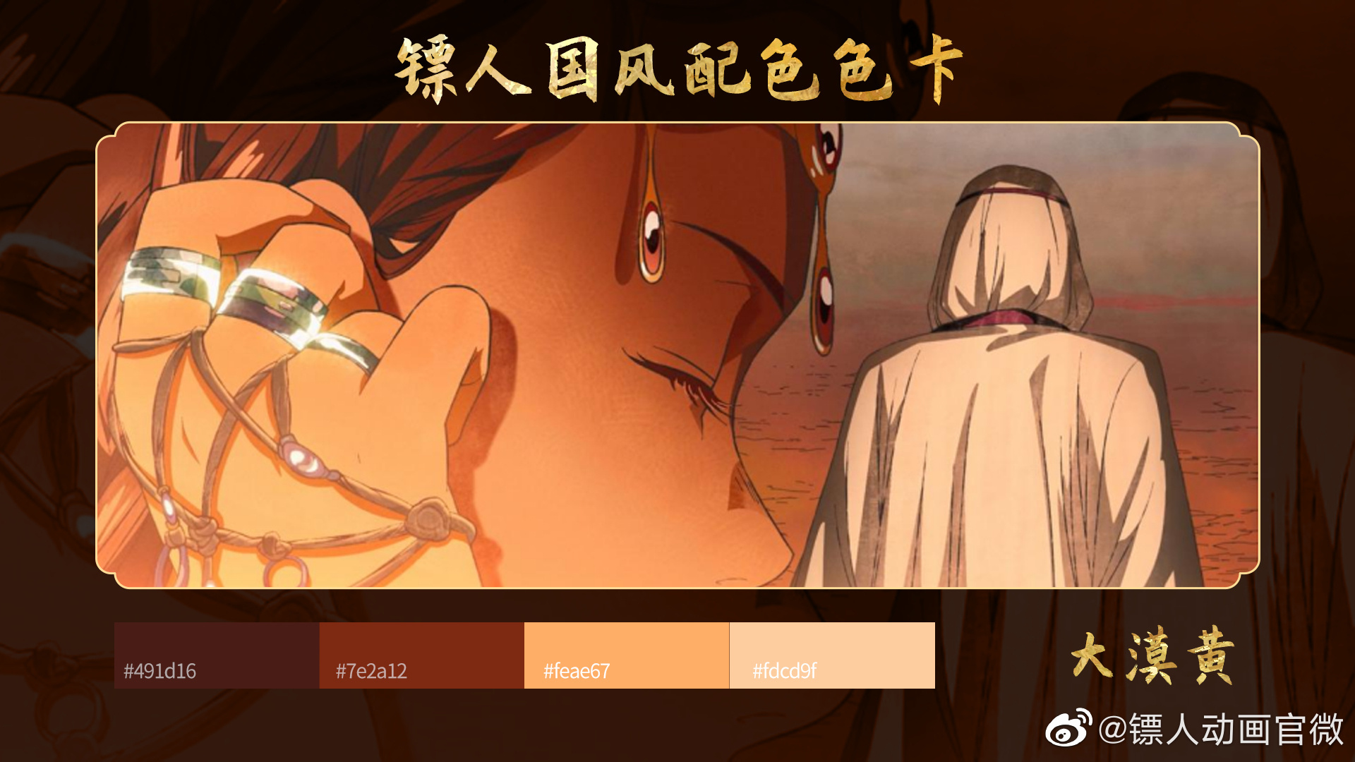 从画面来看,制作团队为动画特意设计的残阳红、大漠黄、刀锋墨、墨染朱等六套专属色卡,被广大动画迷们所喜爱,一如网友评价提及的那样“中式复古的红、幽静深沉的蓝还有体现了大漠风情的配色,在审美这点上,《镖人》真的绝了”。大胆启用的高饱和度色调更是凸显了团队在画面构建及色彩应用上力求品质与极致的双重加持。