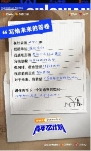 总决选之夜来临前一天,由湖南卫视和芒果TV共同制作的青年共创音乐竞演节目《青年π计划》联合共青团湖南省委、微博校园等,共同发起“写给未来的答卷”活动,邀请青年向未来勇敢发问,与时代共谱青春答卷。