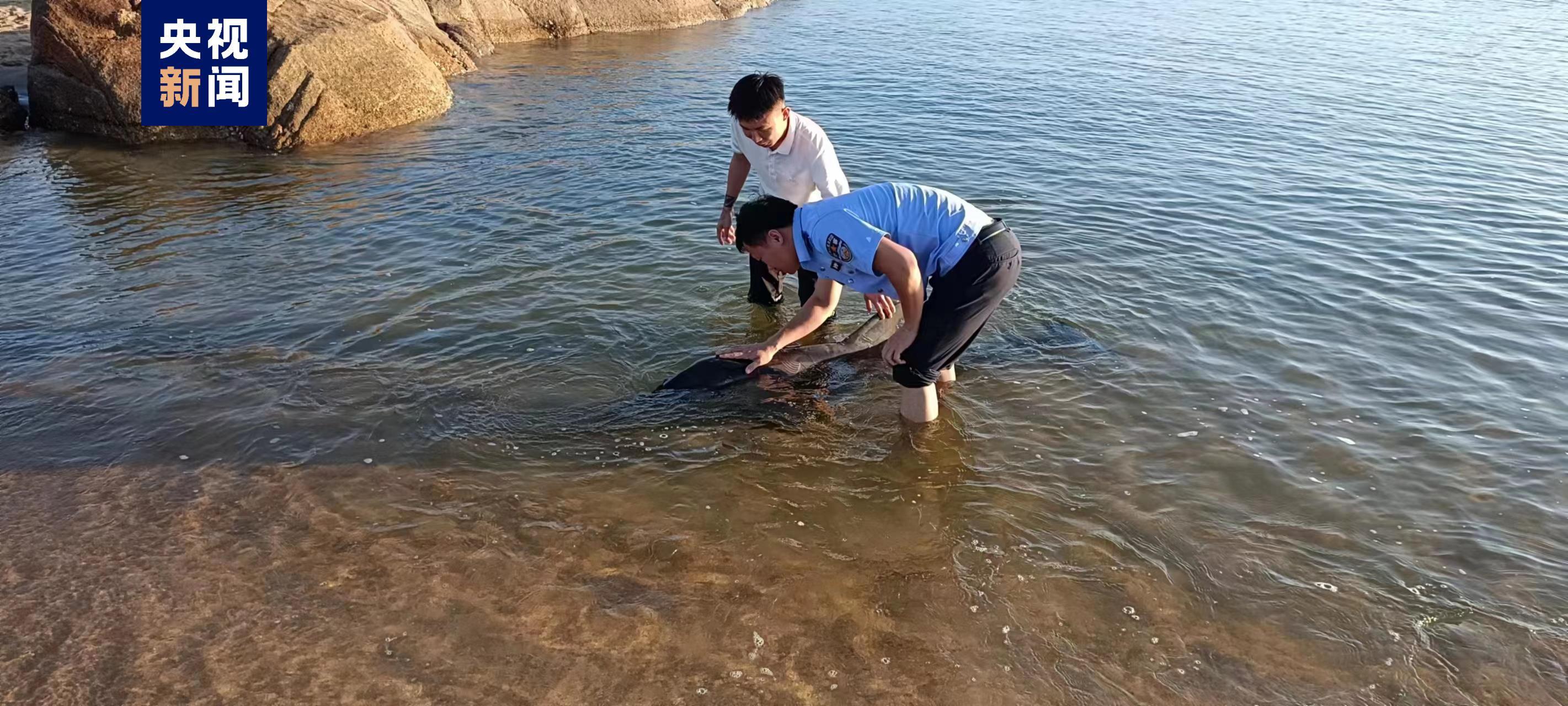 7月13日7时许,万宁市公安局港北海岸派出所接到群众报警求助,在万宁市和乐镇大花角海域,有一只海豚不慎搁浅,派出所民警到达现场后,发现海豚身上仅有少许刮伤,确定并无大碍后,便将海豚放生至港门岭海域。