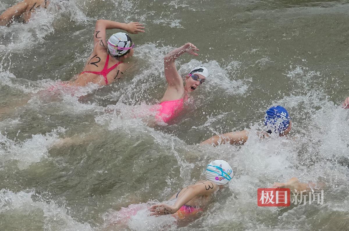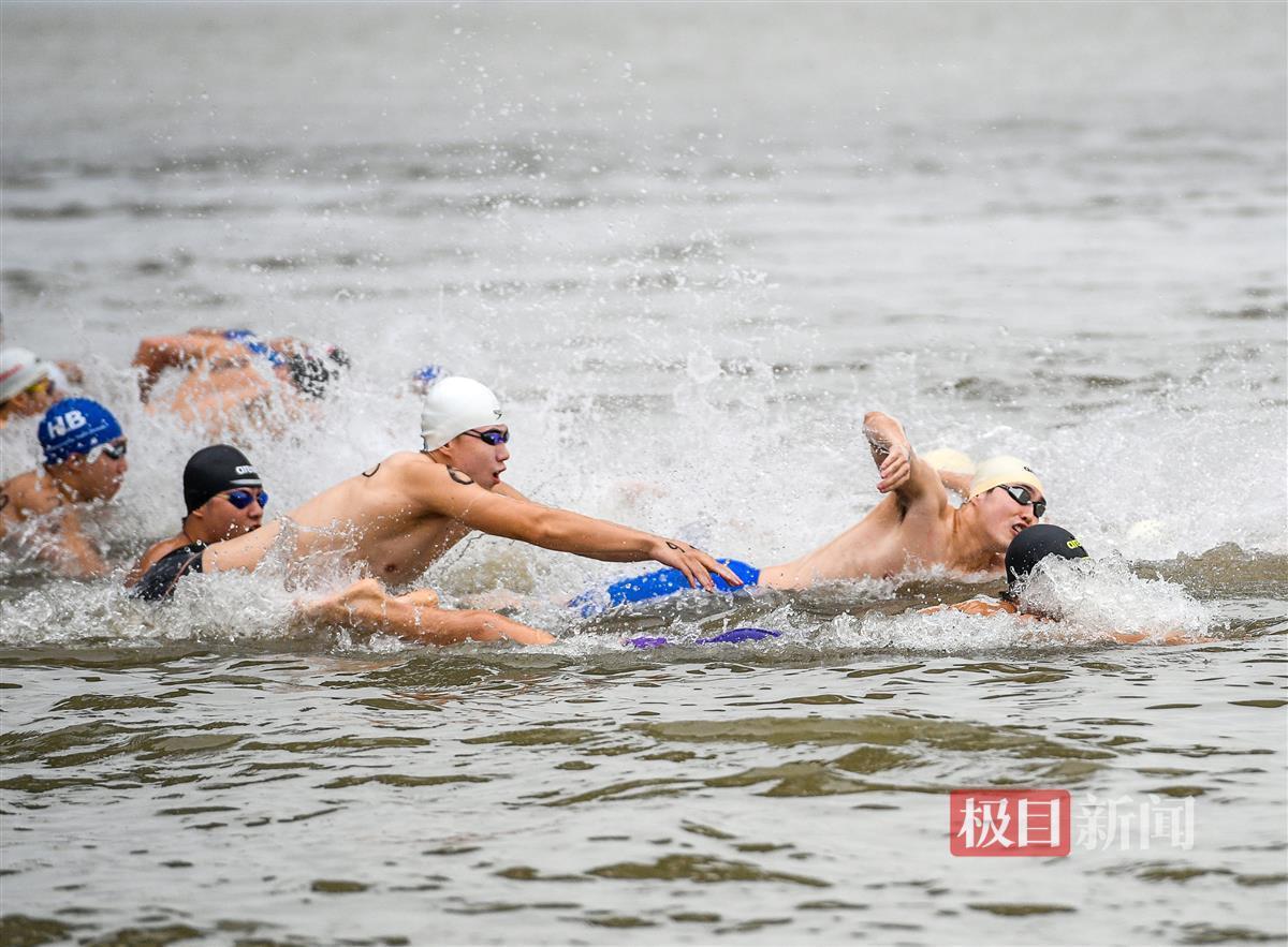 8时10分,发令枪响,个人抢渡长江挑战赛率先开始。只见运动员跃入江面,如蛟龙入水。一时之间,江面水花翻滚,岸边加油声不断。