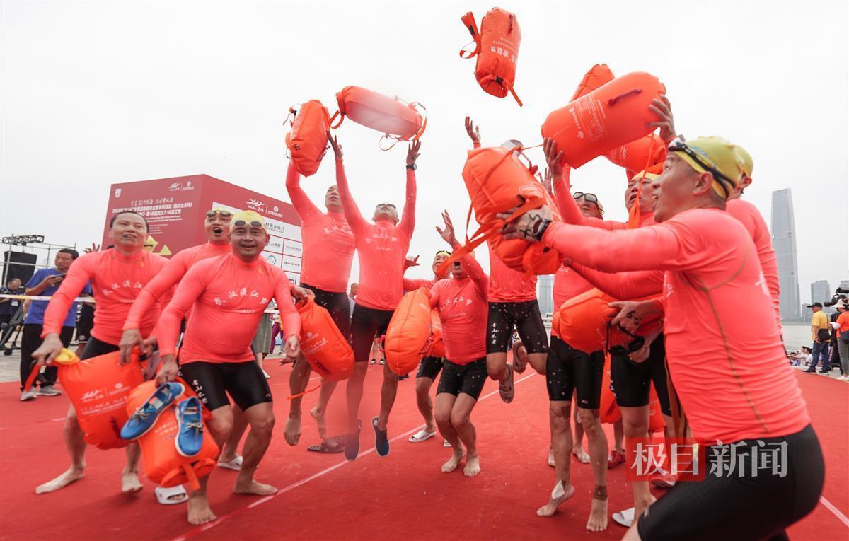 来自广东的运动员曾健第七次参加武汉7·16渡江节,他特别戴上了自己制作的四角羊泳帽,他独树一帜的造型吸引了不少现场观众的目光。他介绍,自己还带了水中的拍摄设备,做好这次横渡长江的全记录。在完成横渡后,他告诉极目新闻记者:“今天感觉挺轻松的,也很开心,长江水很凉爽,虽然今年的流速没有往年的快,但重回长江的感觉特别好!”