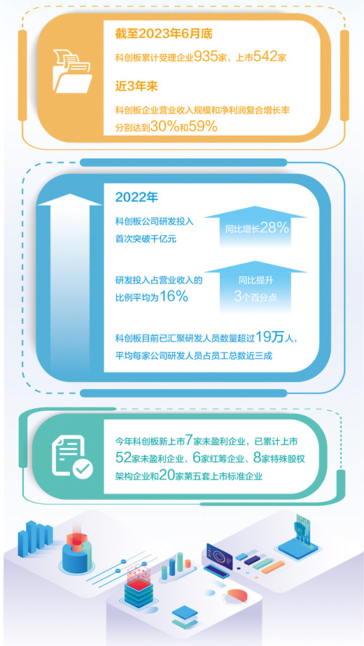 科创板不仅是“硬科技”企业聚集地,也成为持续研发创新的“深耕田”。上交所把提高上市公司质量作为重中之重,支持科创板公司运用再融资、并购重组、股权激励等制度工具做优做强。科创板公司上市后持续深耕主业,研发投入保持高位。2022年,科创板公司研发投入首次突破千亿元,同比增长28%;研发投入占营业收入的比例平均为16%,同比提升3个百分点。