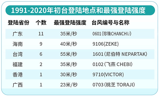 1991-2020年初台登陆地点和最强登陆强度 丁茜制图