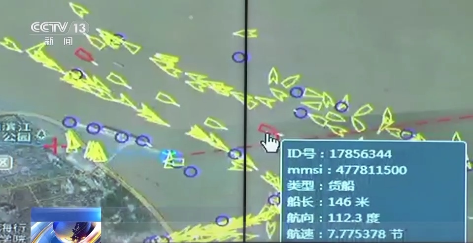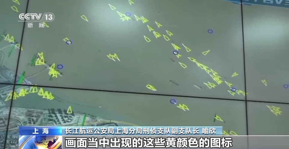 长江航运公安局上海分局刑侦支队副支队长 喻欣:我们现在看到的是长江上海段吴淞口的实时景象。画面当中出现的这些黄颜色的图标代表一艘艘正在长江上海段航行的船舶。我们现在通过多年的智能感知设备的建设,可以实时、全量、多维地感知各类船舶在水域的信息情况。我们点开其中一艘船,了解一下它的相关信息。可以看到这是它的实时信息。这些信息当中,包括它的船籍、船名以及它现在所处的实时位置,它的航速、船上装载的货物以及这些货物的去向在哪里。我们现在来找一找这条船在哪个位置,这个就是刚才黄色图标中代表的那艘货船。