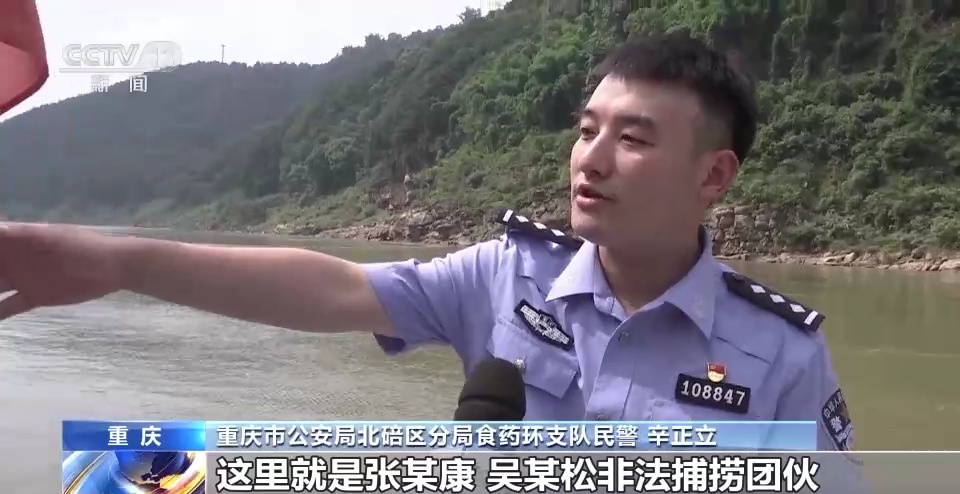 重庆市公安局北碚区分局食药环支队民警 辛正立:这里就是张某康、吴某松非法捕捞团伙具体作案的地方。这里是我们嘉陵江段一个回水湾,这里水深大概有40到60米。