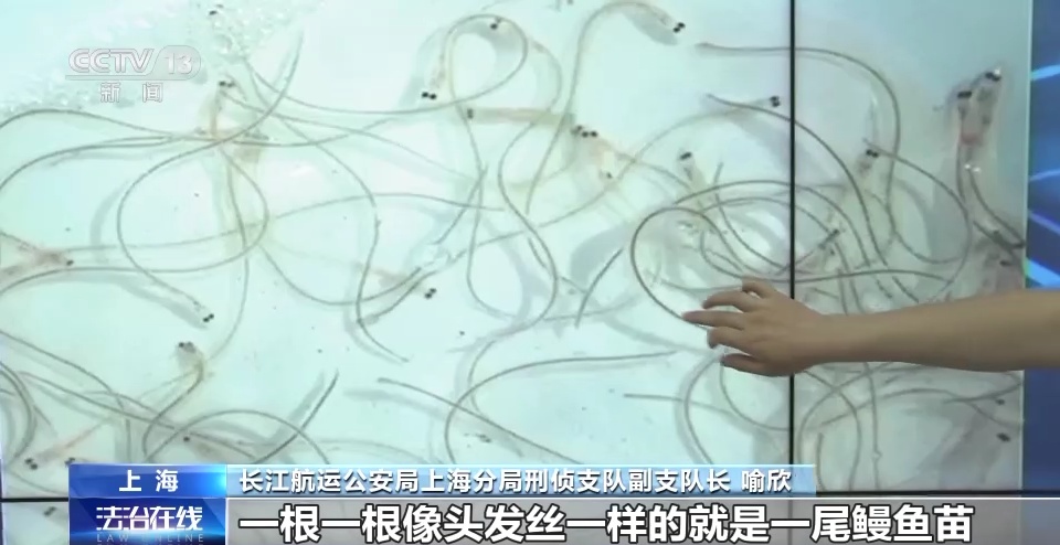 长江航运公安局上海分局刑侦支队副支队长 喻欣:长江口渔业资源非常丰富,其中有一些的经济价值还特别高,比如说鳗鱼苗。大家看到画面当中一根一根像头发丝一样的就是一尾鳗鱼苗,它的价值按照一尾多少钱来计算的,一尾鳗鱼苗它的价值可以在15到20元人民币。再看第二种,这是我们在案件当中查获的一尾长江刀鲚,就是老百姓常说的长江刀鱼。这条它单体长度达到40厘米,它的重量在半斤左右,也就是老百姓俗称的刀鱼王。那么这样一尾刀鱼王,它的价值在5000元左右人民币,甚至还要超过。