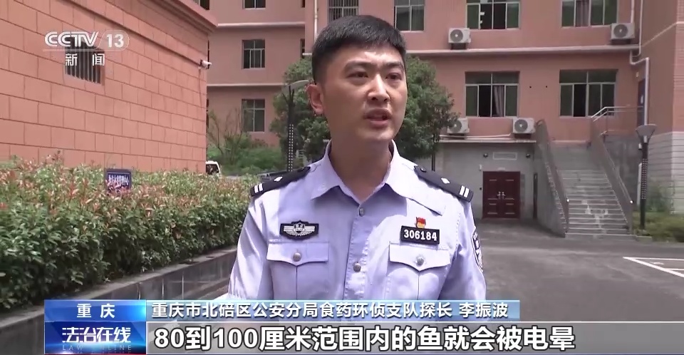 重庆市公安局北碚区分局食药环支队民警 辛正立:因为这里是回水坨,水的漩涡就很明显。漩涡就证明这里边有一个很深的凹陷。凹陷的时候,水流缓慢,鱼群就可以聚集在这里休息产卵。因为鱼喜光,他们在夜晚带着手电筒潜入水底的时候,鱼就会聚集在手电筒光的位置,他们就用防鲨枪电击,电击之后把电晕的鱼放在鱼篓里。