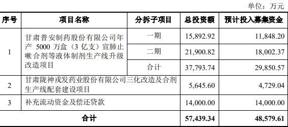 本次向特定对象发行A股股票拟募集资金总额不超过48,579.61万元(含本数),扣除发行费用后全部用于甘肃普安制药股份有限公司年产5000万盒(3亿支)宣肺止嗽合剂等液体制剂生产线升级改造项目、甘肃陇神戎发药业股份有限公司三化改造及合剂生产线配套建设项目、补充流动资金及偿还贷款。