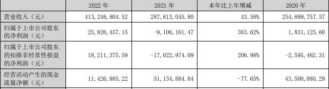 据陇神戎发2022年年报,报告期内,公司实现营业收入4.13亿元,同比增长43.58%;归属于上市公司股东的净利润2582.65万元,同比下增长383.62%;归属于上市公司股东的扣除非经常性损益的净利润1821.14万元,同比增长206.98%;经营活动产生的现金流量净额1142.70万元,同比下降77.65%。