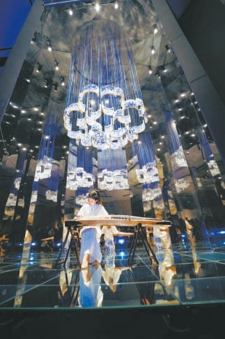 在《花的三重境》空间中,来自湖南师范大学的演奏家丁雪纯在摇摆的青花瓷片作品下演奏了一曲古筝协奏曲《秋韵》,乐曲在瓷片中恣意流淌,带观者一同进入秋实景象……展览将持续至8月10日。