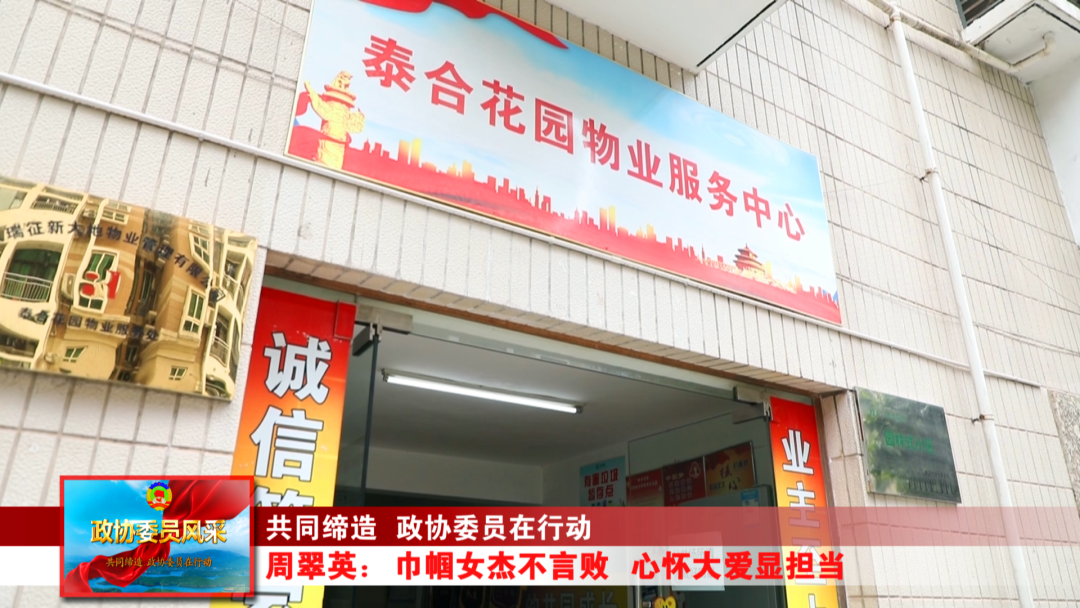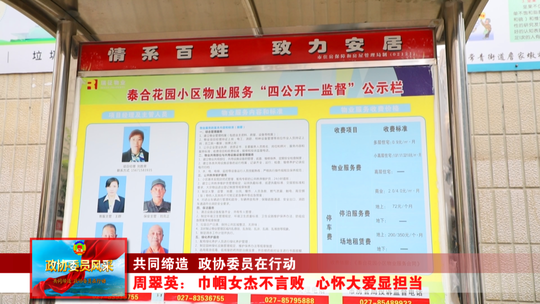 周翠英作为政协委员,她始终把深入群众、切实解决群众困难作为自己的责任。她带领团队进驻脏乱差的城中村和老旧小区,提供全面规范的物业管理服务,面对人多事杂,环境乱的泰和花园小区,她没有退缩,始终用自己的真诚和服务去感染身边的人和事,2021年泰和小区在江汉区“美丽街区”评比中名列前十位。