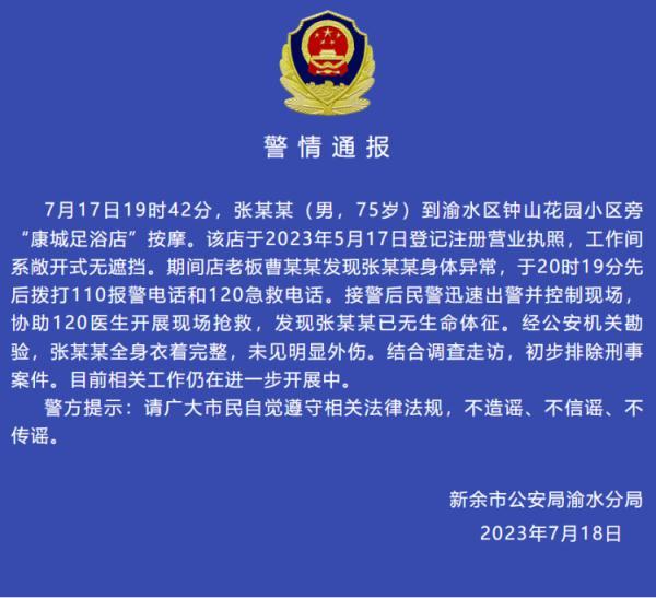 通报介绍,7月17日19时42分,张某某(男,75岁)到渝水区钟山花园小区旁“康城足浴店”按摩。该店于2023年5月17日登记注册营业执照,工作间系敞开式无遮挡。期间店老板曹某某发现张某某身体异常,于20时19分先后拨打110报警电话和120急救电话。接警后民警迅速出警并控制现场,协助120医生开展现场抢救,发现张某某已无生命体征。经公安机关勘验,张某某全身衣着完整,未见明显外伤。结合调查走访,初步排除刑事案件。目前相关工作仍在进一步开展中。