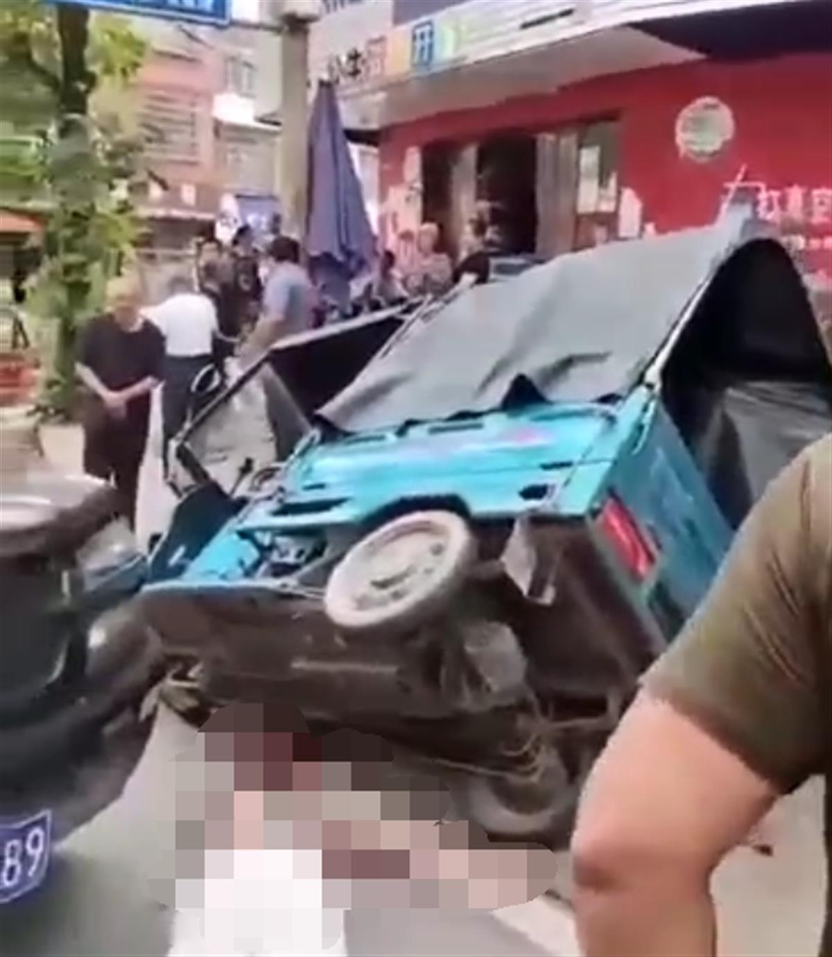 另一段现场视频中,一女子躺在三轮车旁边,没有动弹。网传的多个视频中,均未看到事故发生的瞬间,未记录到该女子倒地时的情况。