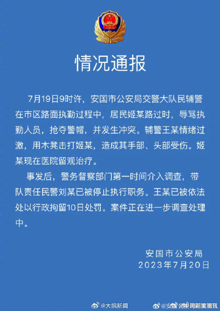 7月20日,安国市公安局通报,7月19日9时许,安国市公安局交警大队民辅警在市区路面执勤过程中,居民姬某路过时,辱骂执勤人员,抢夺警帽,并发生冲突。辅警王某情绪过激,用木凳击打姬某,造成其手部、头部受伤。姬某现在医院留观治疗。目前,带队责任民警刘某已被停止执行职务。辅警王某已被依法处以行政拘留10日处罚。案件正在进一步调查处理中。