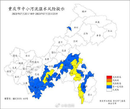 7月20日14时,重庆市水利局和重庆市气象局联合发布中小河流涨水风险提示。预计,7月20日14时-7月20日20时,全市13个地部分中小河流有涨水风险。请相关区县加强值班值守,密切关注水雨情变化,注意做好防范工作。