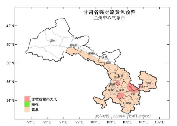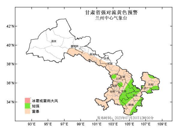 兰州中心气象台2023年7月20日12时00分发布甘肃省强对流黄色预警:预计未来24小时,我省张掖以东大部分地方将有雷暴;其中,定西、陇南、天水、平凉等市部分地方及白银市南部、甘南州东部、兰州和庆阳两市局部地方将有短时强降水,并伴有阵性大风,主要时段在20日15时-21日02时,最大小时雨强40-60毫米;定西、天水、平凉三市局部地方及陇南市西北部、白银市南部将有冰雹,主要时段在20日14时-22时。请注意防范!