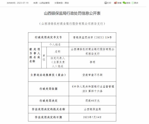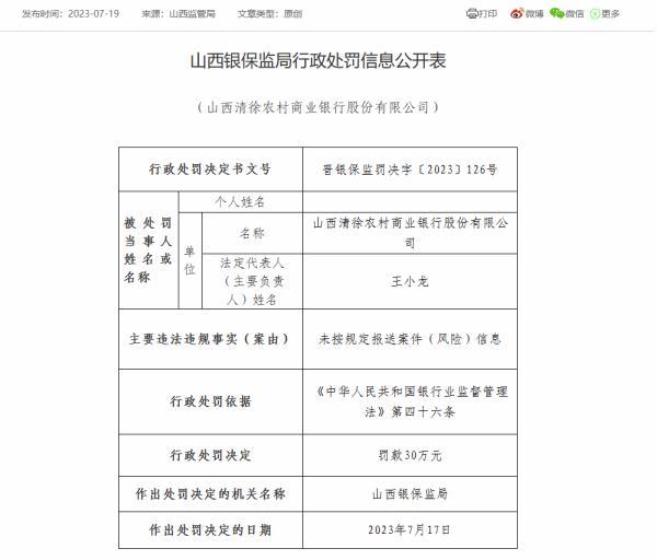 7月19日,山西银保监局公布的行政处罚信息公开表显示,山西清徐农村商业银行因未按规定报送案件(风险)信息,被罚款30万元;该行王答支行、西谷支行均因贷款审查不尽职,被山西银保监局分别罚款30万元、40万元。