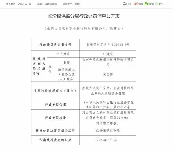 7月18日,临汾银保监分局公布的行政处罚信息公开表显示,山西古县农村商业银行因关联方认定不全面,未及时将相关业务纳入关联交易管理,被责令改正,罚款20万元。