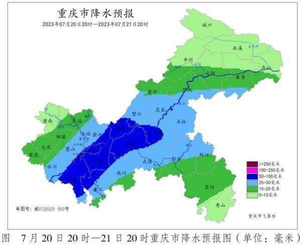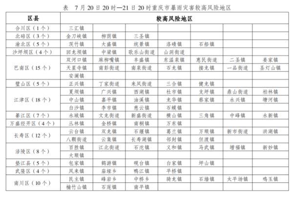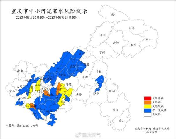 7月20日20时-21日20时重庆市中小河流涨水风险提示图(重庆市水利局、重庆市气象局联合发布)