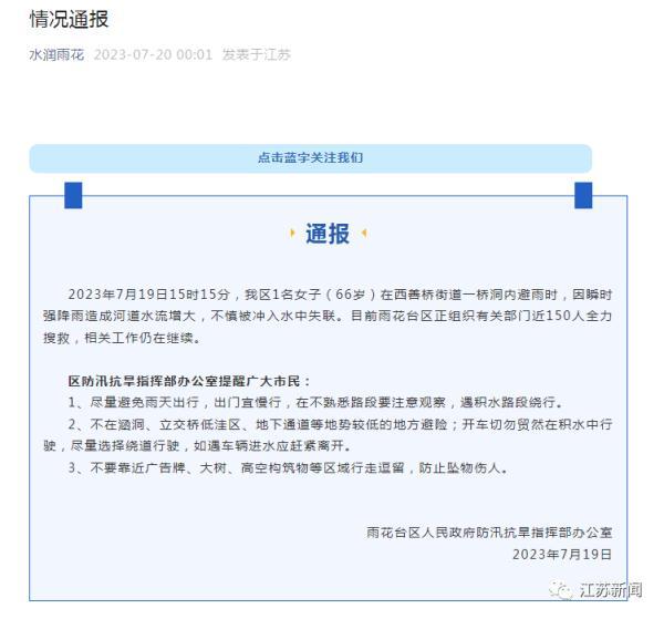 2023年7月19日15时15分,我区1名女子(66岁)在西善桥街道一桥洞内避雨时,因瞬时强降雨造成河道水流增大,不慎被冲入水中失联。目前雨花台区正组织有关部门近150人全力搜救,相关工作仍在继续。